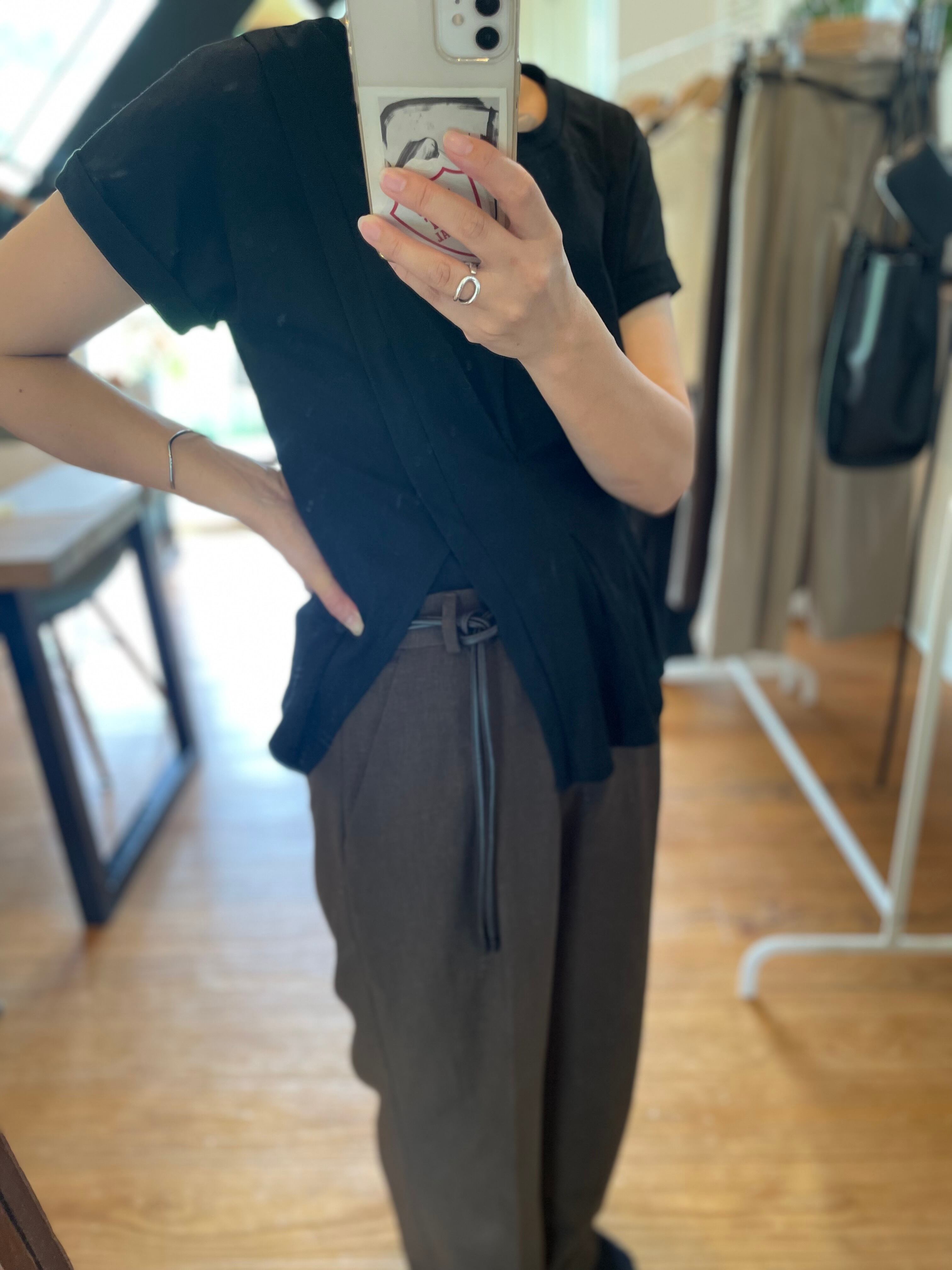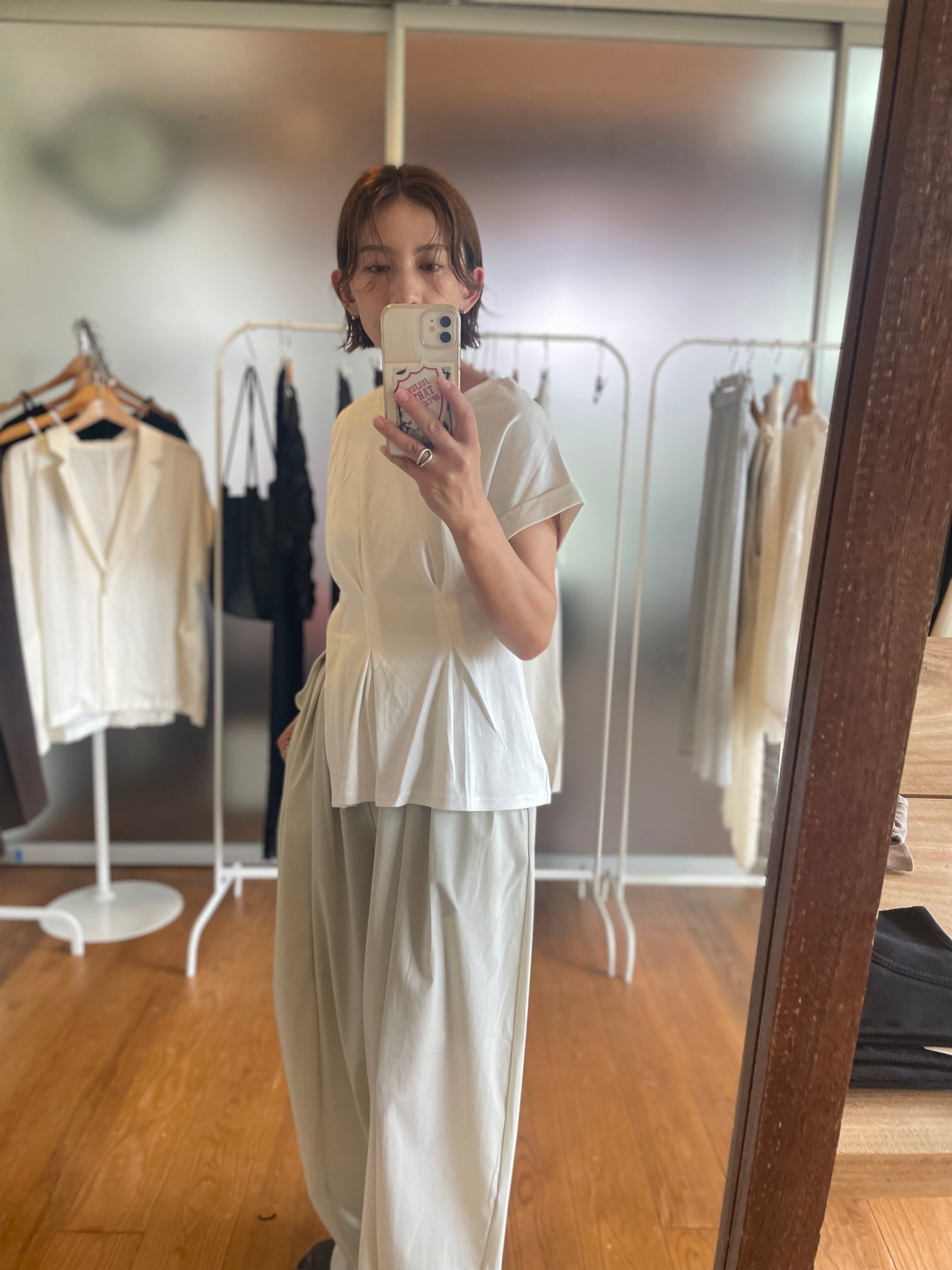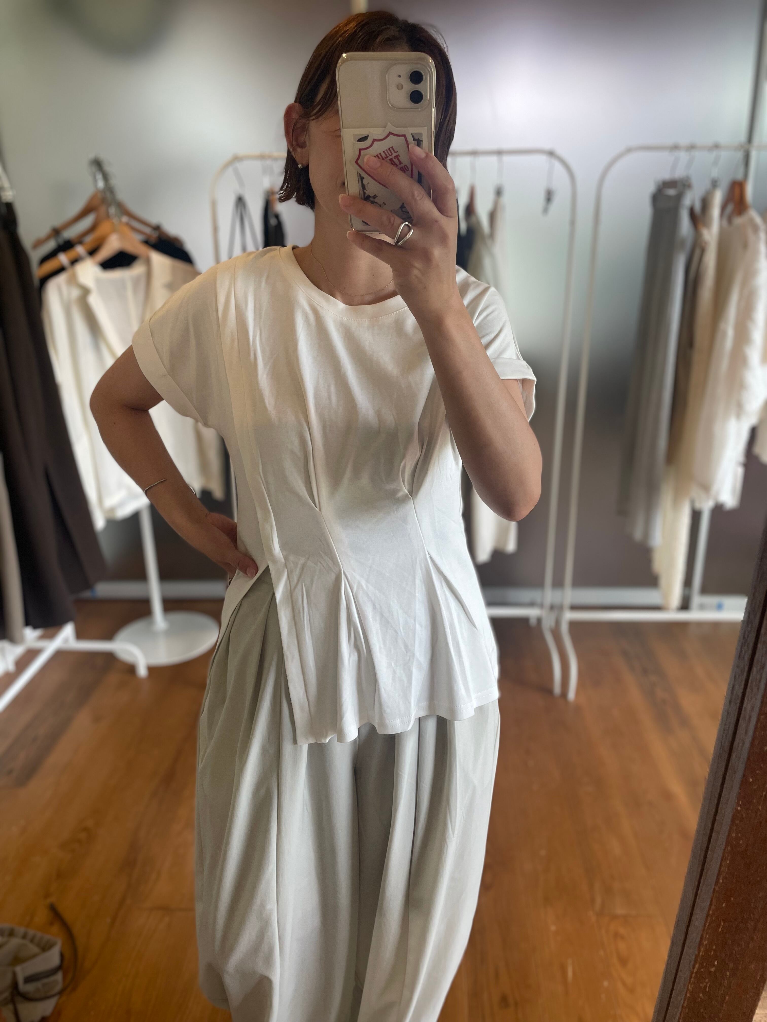 上品な抜け感と立体感を演出する、フロントタックデザインのスリット入りトップス。ミニマルな中にもディテールで差がつく、大人のためのニュアンスアイテムです。フロントに施したタックが、さりげなく縦ラインを強調し、すっきりとした印象に。柔らかな生地感が身体のラインを拾いすぎず、タック部分によってスタイルアップしてみえます。Mサイズのみのワンサイズ仕様で、ほどよいゆとりのあるシルエットに仕上げています。